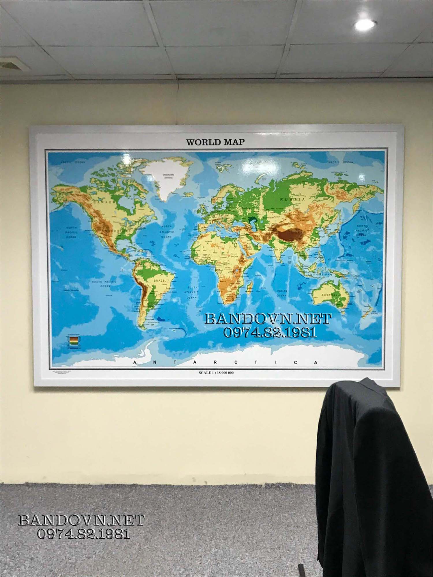 Bản đồ địa lý thế giới (Geographical world map) tuyệt đẹp, lý tưởng cho văn phòng hoặc môi trường giáo dục. Bản đồ thế giới này mô tả chính xác chi tiết địa hình, thông qua sự pha trộn độc đáo giữa mô hình độ cao kỹ thuật số và biểu diễn bề mặt thực tế. Bản đồ vật lý kích thước lớn cho thấy các đặc điểm vật lý bao gồm núi, sông, đảo, biển và vịnh… Bản đồ trình bày đẹp, khoa học, rất dễ dàng sử dụng để tra cứu phục vụ công việc, học tập và dùng để trang trí văn phòng công ty, cơ quan, trường học tạo không gian lịch sự và trang trọng.